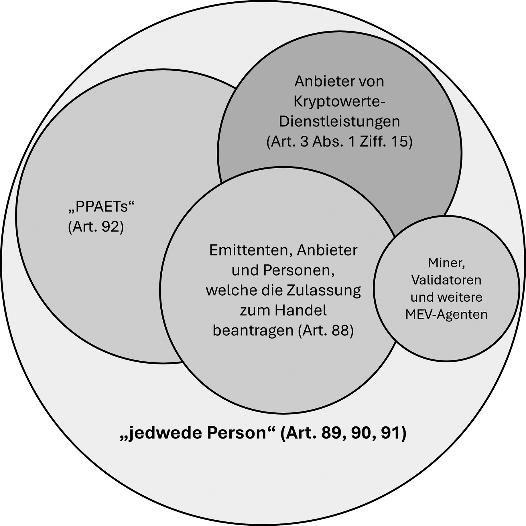 Der persönliche Anwendungsbereich des MiCAR-Marktverhaltensrechts ist sehr offen formuliert, sodass sich grundsätzlich natürliche und juristische Personen sowie Rechtsgemeinschaften im Anwendungsbereich befinden (vgl. auch Art. 2 Abs. 1 MiCAR). Zu denken ist neben Anbietern von Kryptowerte-Dienstleistungen, deren Kunden und Mitarbeitern etwa an Emittenten und Anbieter von Kryptowerten sowie Personen, die direkt am Markt teilnehmen, ohne auf die Dienstleistungen eines Finanzintermediärs zurückzugreifen. Nicht massgeblich ist, zumal heute noch keine echte Autonomie solcher Strukturen vorliegt, ob die fragliche Person einen Smart Contract, einen computergestützten Algorithmus oder einen KI-Agenten einsetzt.[53]Vgl. Maume, Art. 86, MiCAR Kommentar, Rz 12; ähnlich Zetzsche/Woxholth, 165; ferner EWG 96 MiCAR.