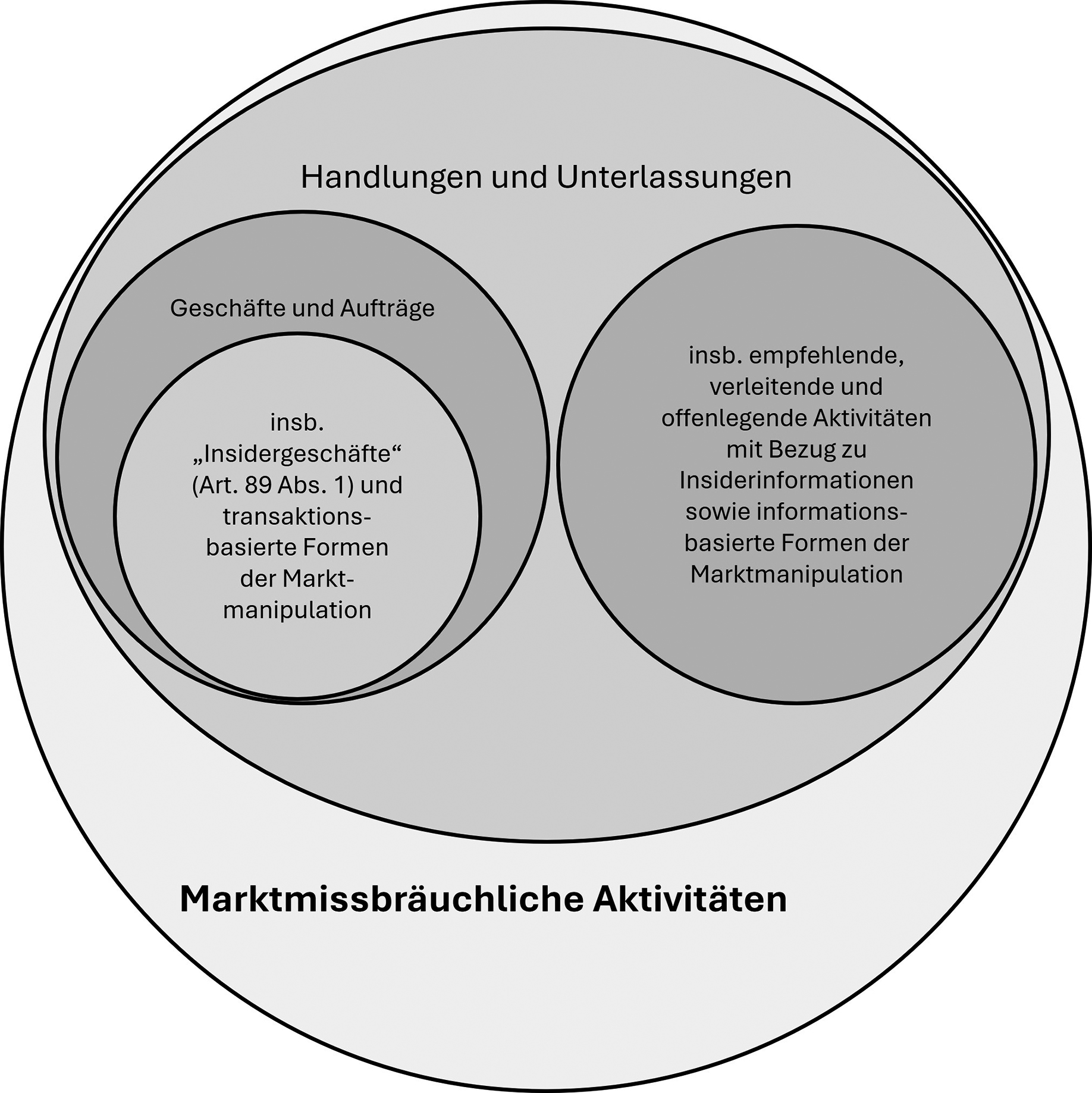 Andererseits wird der weit zu verstehende Begriff der „Handlungen“ bzw. „Unterlassungen“ verwendet, der zudem die blosse Empfehlung oder Verleitung zu Insidergeschäften oder die (unrechtmässige) Offenlegung von Insiderinformationen (Art. 89 Abs. 2 und 3, Art. 90 MiCAR) oder die Verbreitung von irreführenden oder falschen Signalen bzw. Informationen gegenüber den Medien oder dem Markt (Art. 91 Abs. 2 und 3 MiCAR) umfasst.